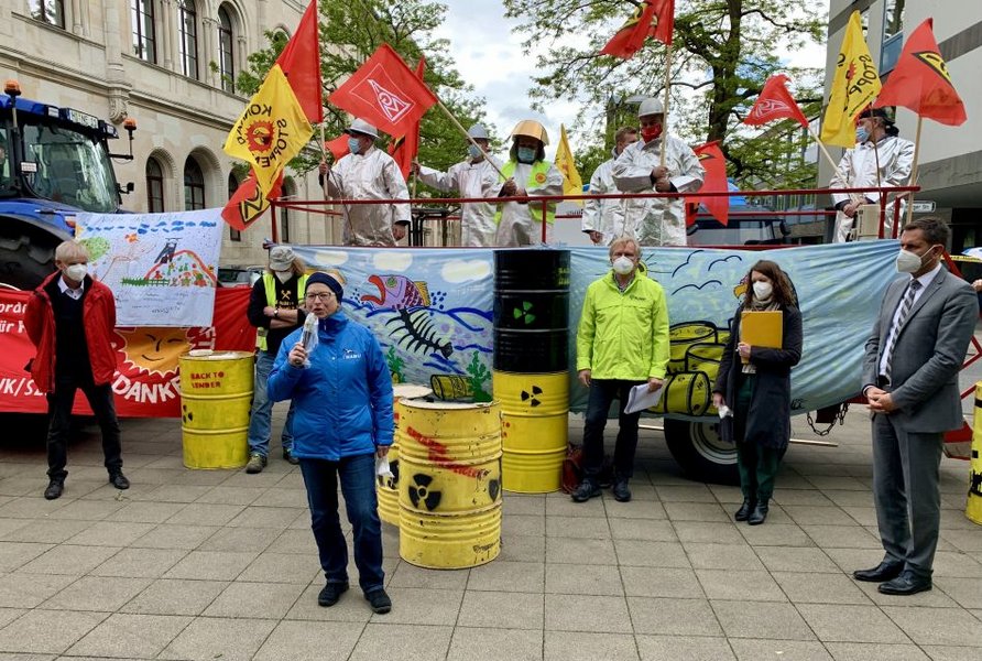 (Fr. 28.05.21/MN) So lässt es sich zusammen fassen, warum sich heute ca. 100 Menschen aus der Region Salzgitter / Braunschweig auf den Weg nach Hannover machten, um dem niedersächsischen Umweltminister Olaf Lies den Antrag auf Rücknahme des Planfeststellungsbeschlusses für das Endlager Schacht KONRAD persönlich zu übergeben. Sie vertreten dort eindrucksvoll das breite Bündnis bestehend aus der Stadt Salzgitter, IG Metall Salzgitter-Peine, Nds. Landvolk Braunschweiger Land e.V und der Arbeitsgemeinschaft Schacht KONRAD, das diese Forderung jetzt stellt und vom zuständigen Ministerium die fachliche Prüfung des Antrages einfordert.