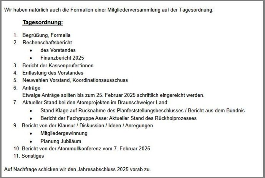 (18-2-2026/Sg) Die jährliche Mitgliederversammlung der AG Schacht KONRAD e.V. steht vor der Tür. Der Termin für die Versammlung ist der 4. März um 19.00 Uhr im DGH Bleckenstedt und wir freuen uns darauf gemeinsam auf das vergangene Jahr zurückzublicken. Im letzten Jahr haben wir eine Menge Aktionen durchgeführt und über unsere Arbeit informiert. Nun ist es an der Zeit, „Rechenschaft“ abzulegen. Hierzu werden wir folgende Themen besprechen: