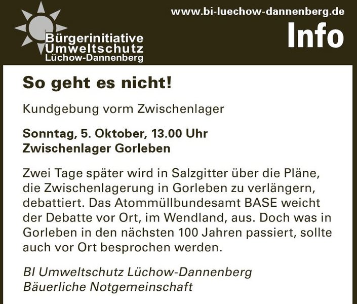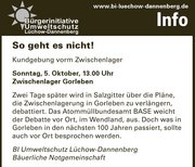 (Pressemitteilung der Bürgerinitiative Umweltschutz Lüchow-Dannenberg e.V./ 01.10.2025) Die Bürgerinitiative Umweltschutz Lüchow-Dannenberg (BI) und die Bäuerliche Notgemeinschaft rufen für Sonntag, den 5. Oktober, um 13 Uhr auf zu einer Kundgebung vorm Zwischenlager Gorleben. Zwei Tage später wird in Salzgitter, dem Sitz des Bundesamtes für die Sicherheit der nuklearen Entsorgung (BASE) über die Pläne, die Zwischenlagerung in Gorleben zu verlängern, debattiert.