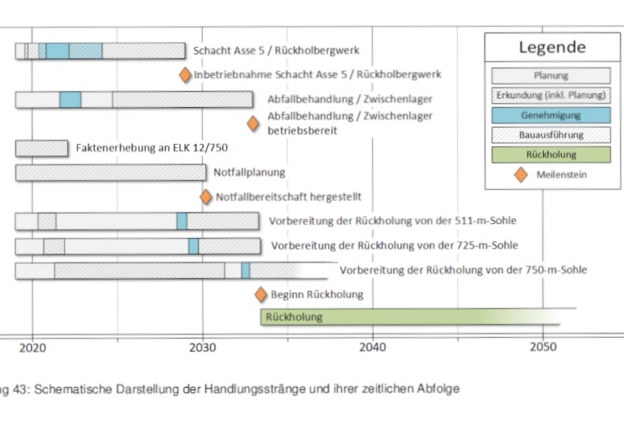 Dieser neue Zeitplan liegt bis heute (Ende Januar 2026) immer noch nicht vor und soll wohl erst im März vorgestellt werden. Mittlerweile hat die BGE jedoch die einzelnen Vorhaben der Rückholung in sog. „Antragskomplexe“ zusammengefasst.