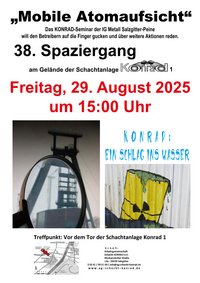 Das KONRAD-Seminar der IG Metall ruft für Freitag, 29. August 2025 zur „Mobilen Atomaufsicht“ unter dem Motto: "KONRAD - Ein Schlag ins Wasser!" am Gelände des geplanten Atommülllagers Schacht KONRAD…